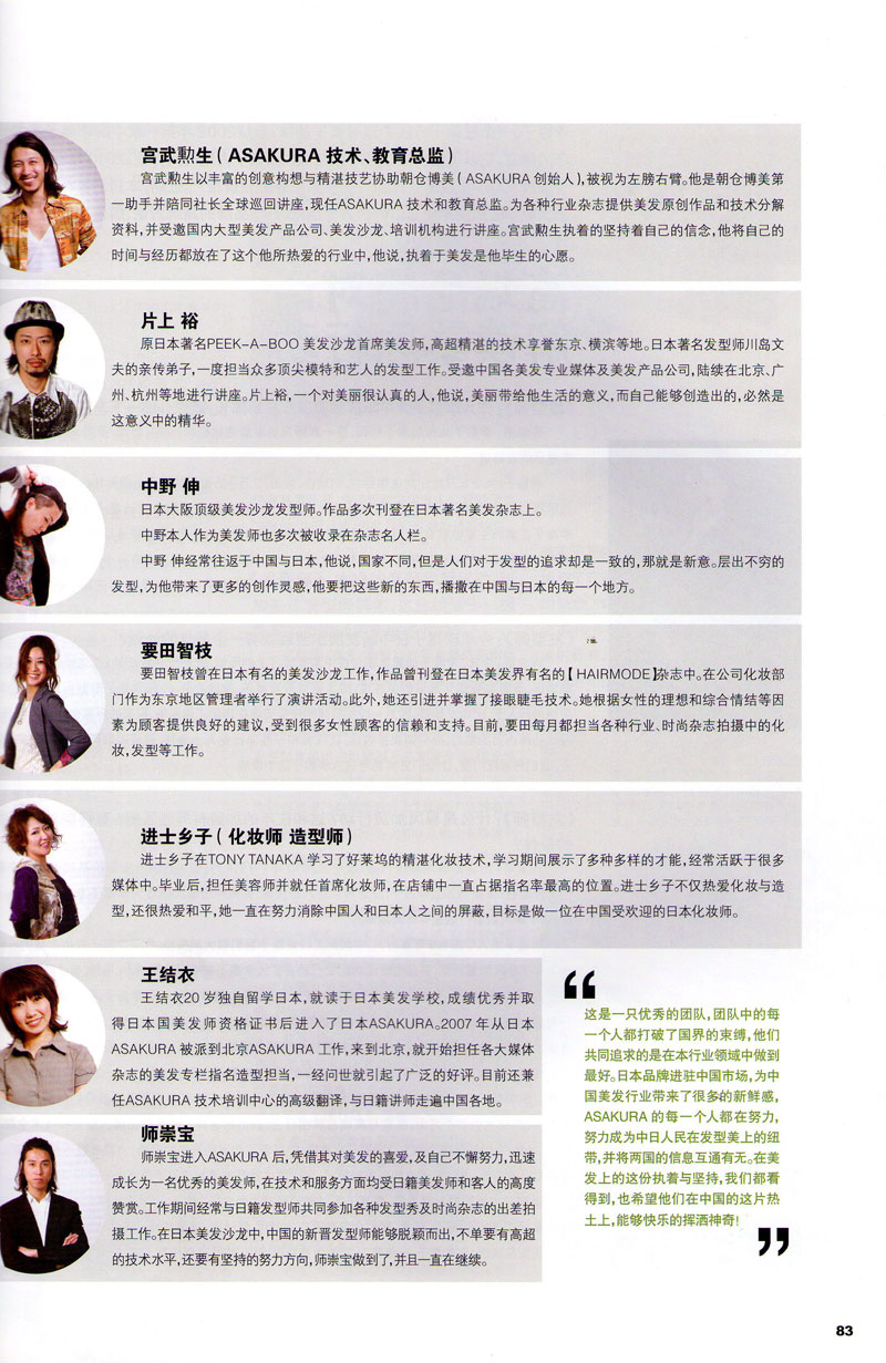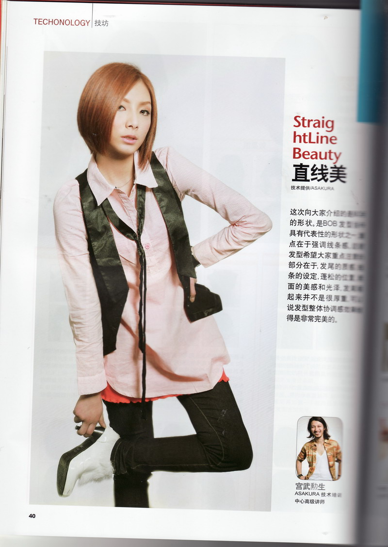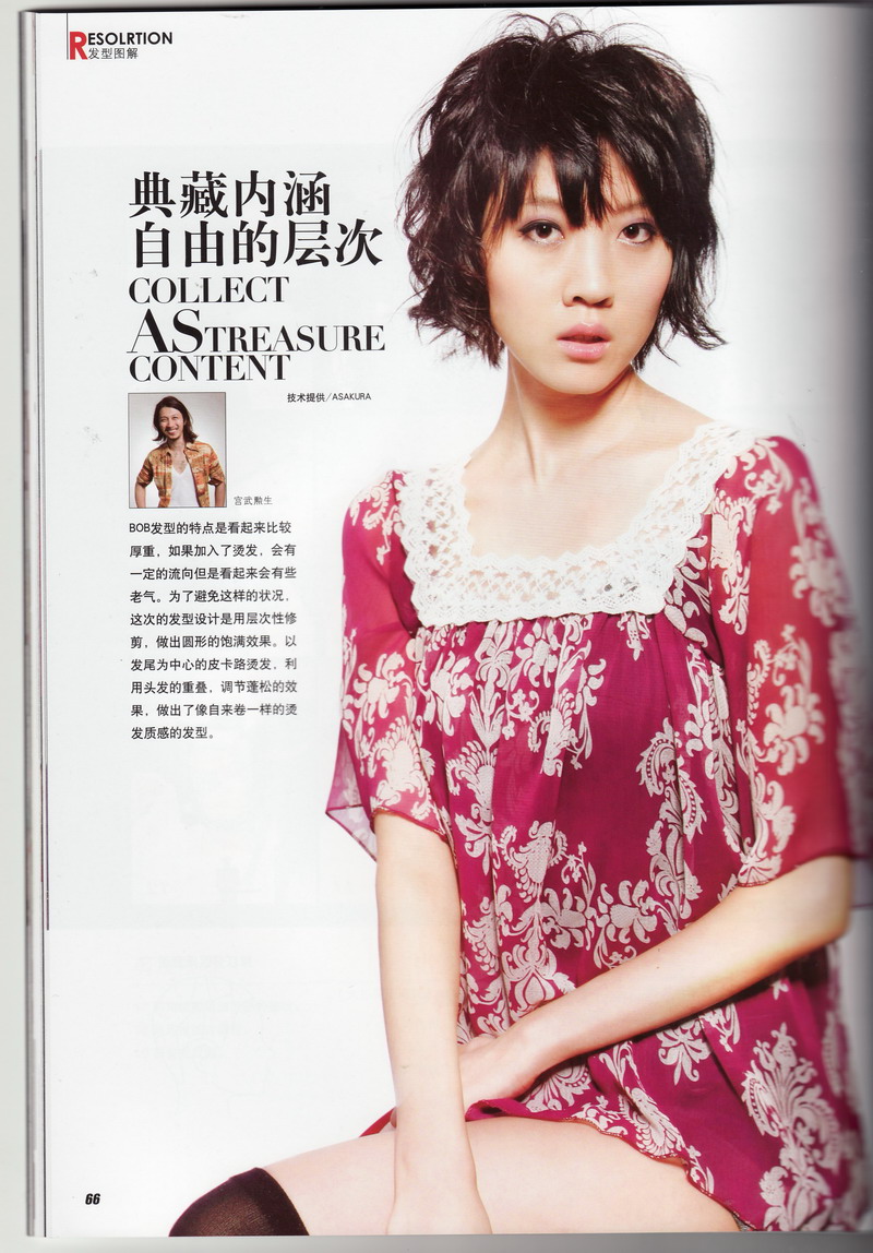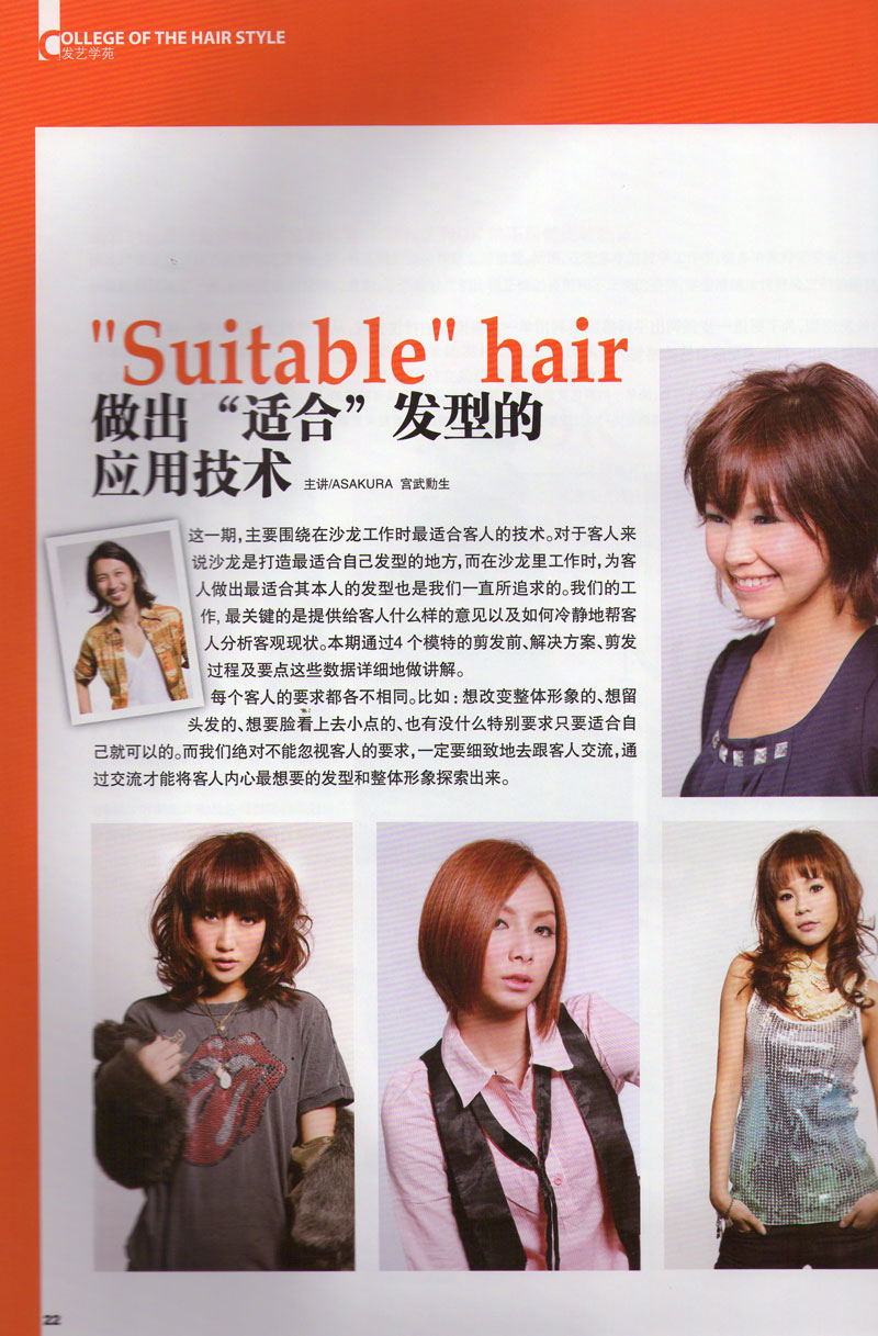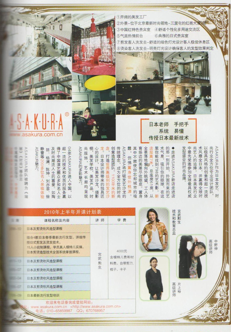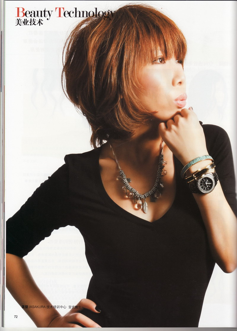 | 将日式发型技术真正的带给中国的美发师朋友们,ASAKURA老师们每月都挤出时间来,精心准备技术讲解,给各美发杂志提供技术资料,借助众多美发行业杂志平台与中国美发师们交流,带给中国清新自然的日本风!从04年起就给美业,美容美发等专业杂志一期不落地提供技术资料。目前为止每月ASAKURA培训中心给《美业》,《美容美发》,《翡仕》,《丝艺》,《彩》,《飘》,《现代沙龙》,《FM》,《TOP》等国内优秀美发杂志提供技术资料及发型作品。 |