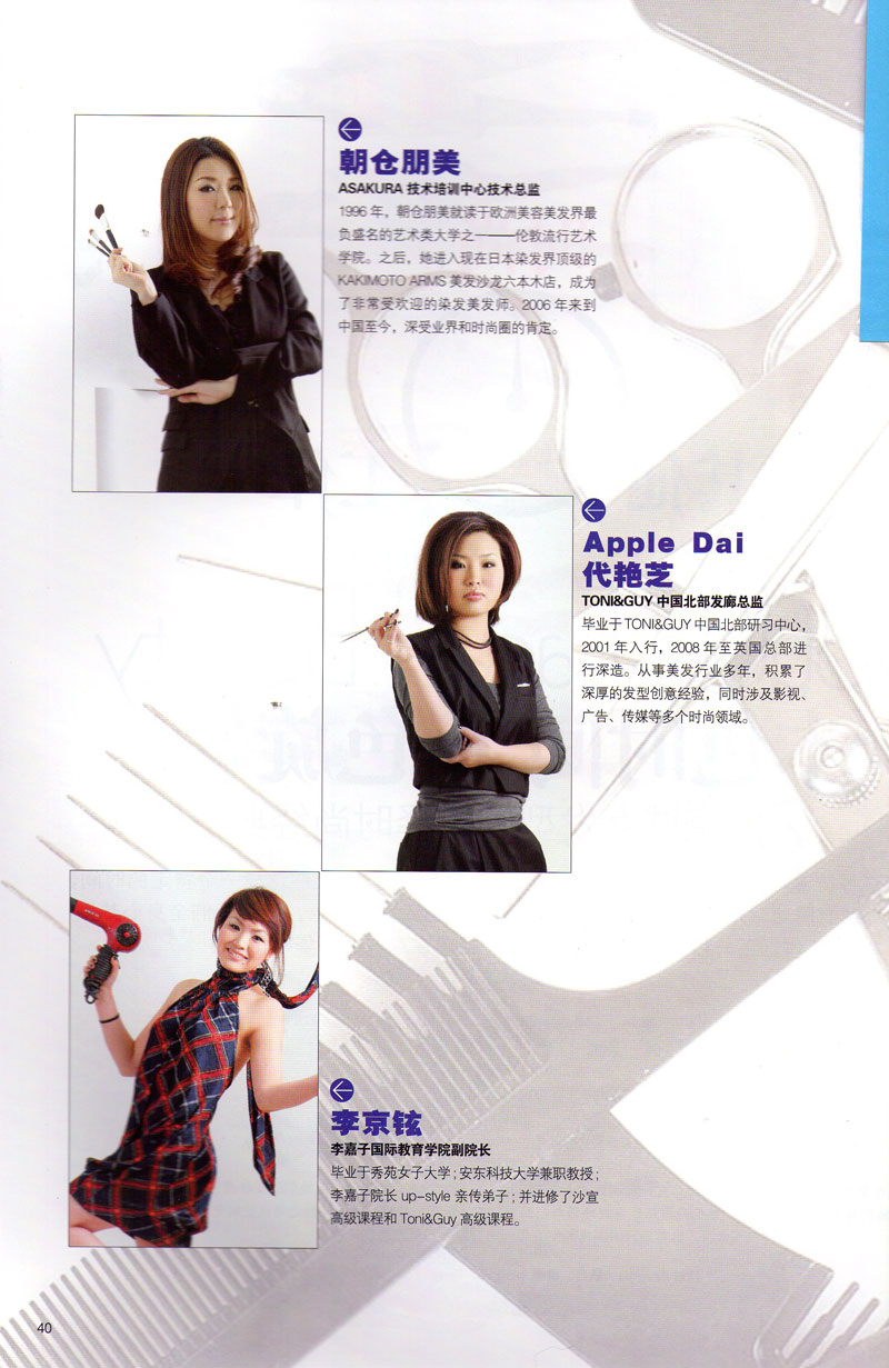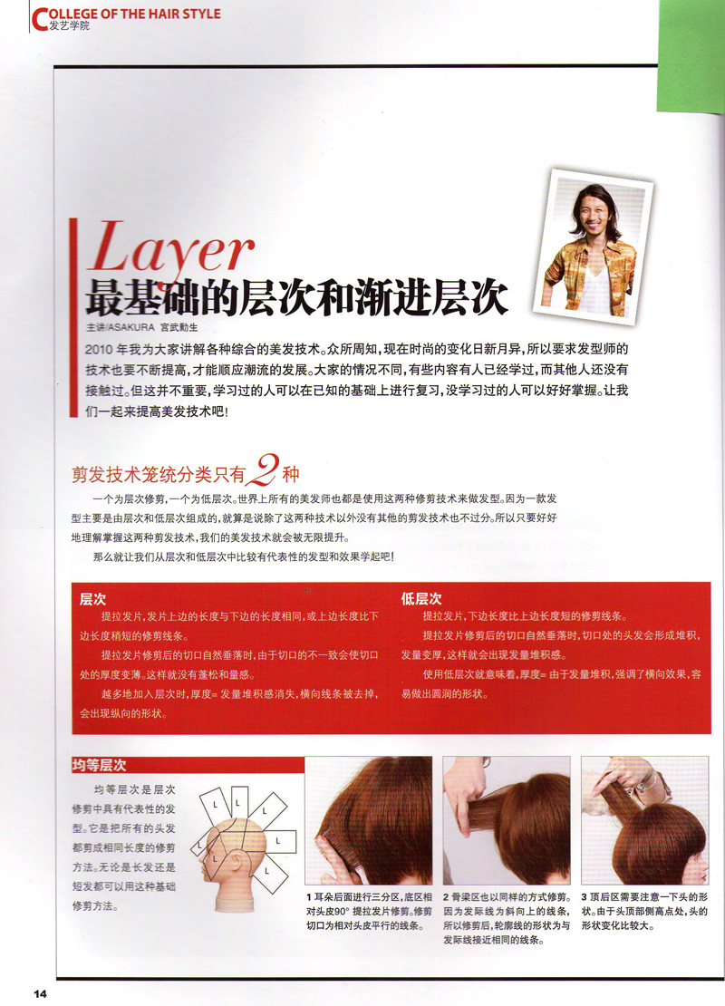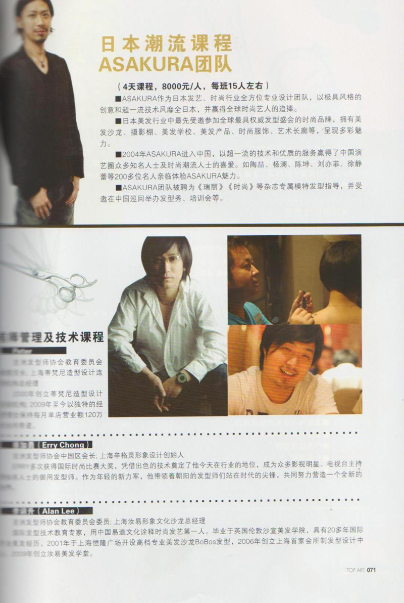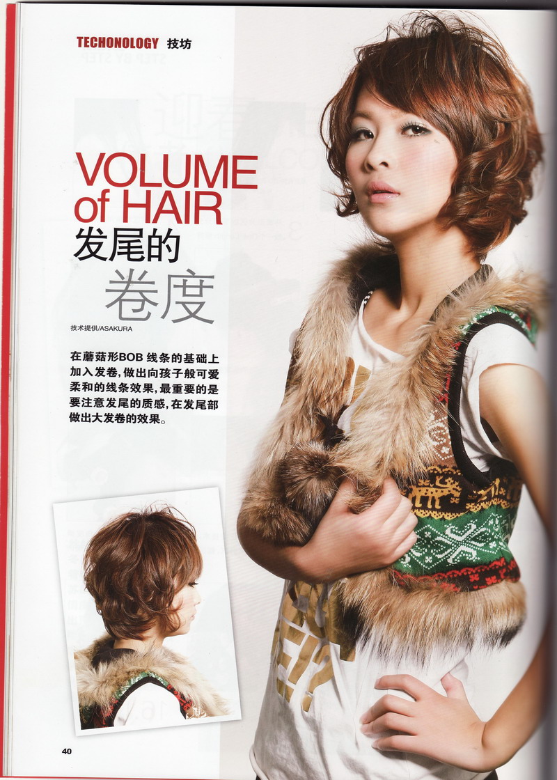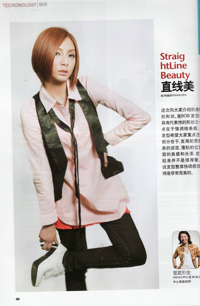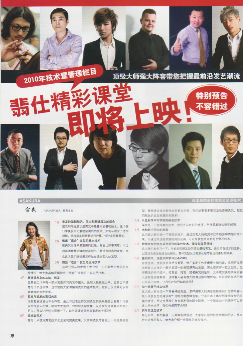 | 将日式发型技术真正的带给中国的美发师朋友们,ASAKURA老师们每月都挤出时间来,精心准备技术讲解,给各美发杂志提供技术资料,借助众多美发行业杂志平台与中国美发师们交流,带给中国清新自然的日本风!从04年起就给美业,美容美发等专业杂志一期不落地提供技术资料。目前为止每月ASAKURA培训中心给《美业》,《美容美发》,《翡仕》,《丝艺》,《彩》,《飘》,《现代沙龙》,《FM》,《TOP》等国内优秀美发杂志提供技术资料及发型作品。 |