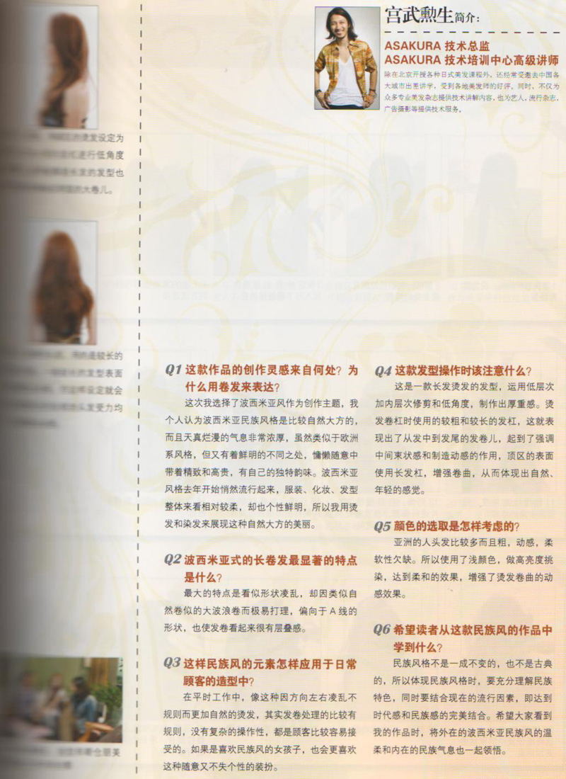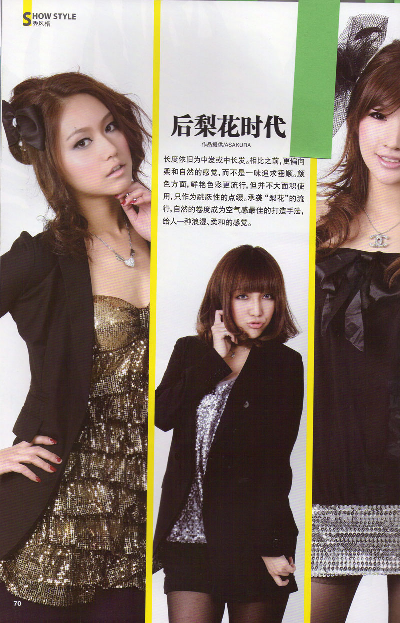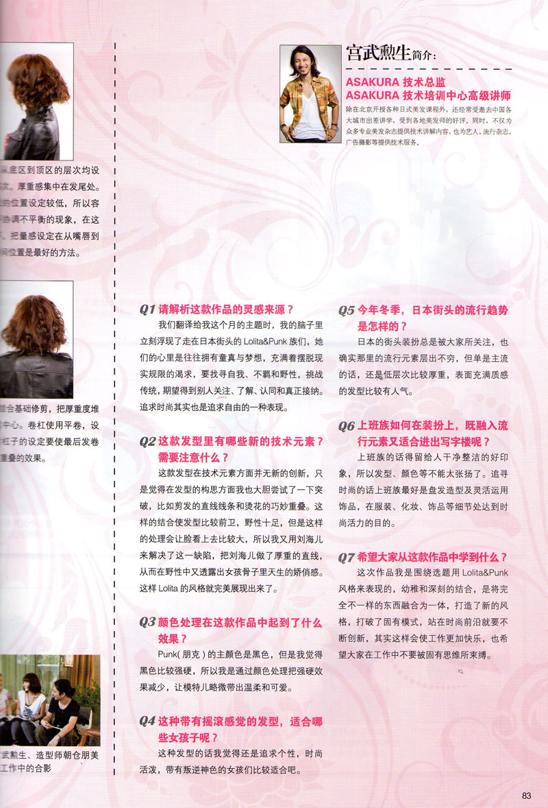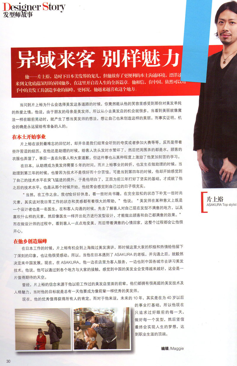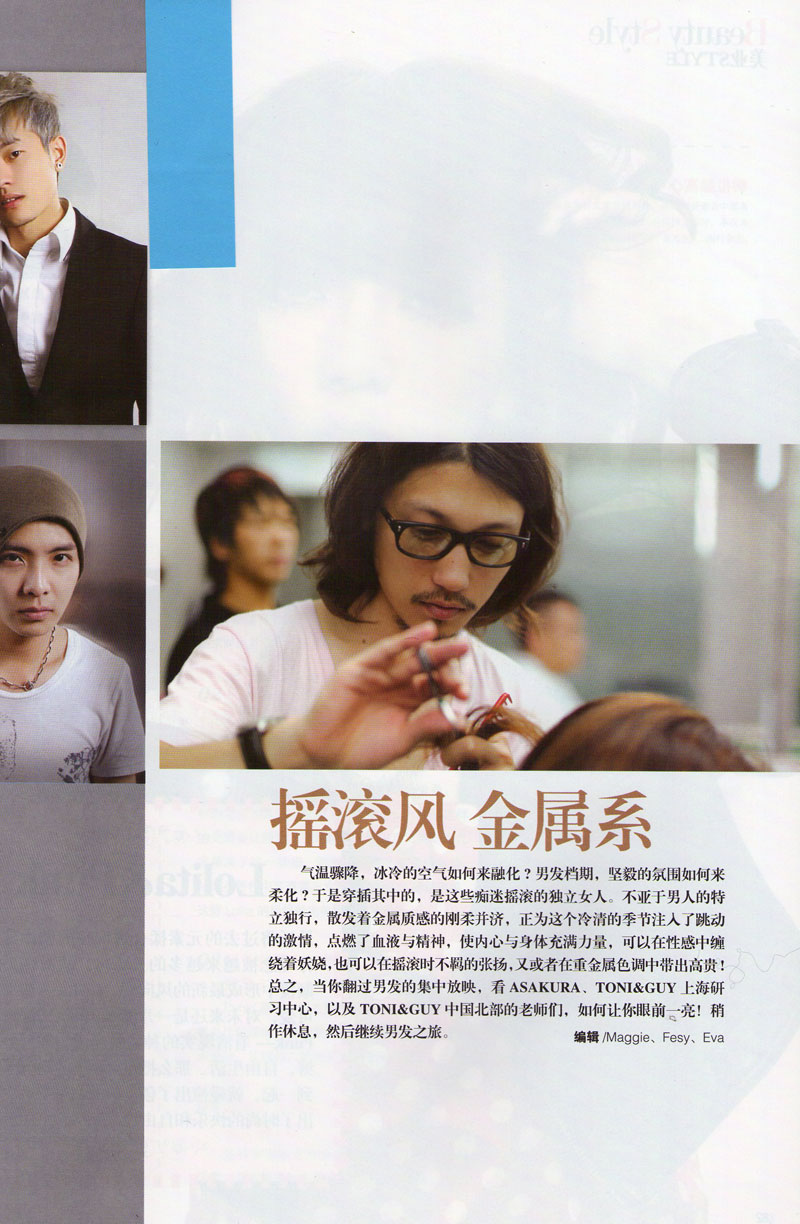 | 将日式发型技术真正的带给中国的美发师朋友们,ASAKURA老师们每月都挤出时间来,精心准备技术讲解,给各美发杂志提供技术资料,借助众多美发行业杂志平台与中国美发师们交流,带给中国清新自然的日本风!从04年起就给美业,美容美发等专业杂志一期不落地提供技术资料。目前为止每月ASAKURA培训中心给《美业》,《美容美发》,《翡仕》,《丝艺》,《彩》,《飘》,《现代沙龙》,《FM》,《TOP》等国内优秀美发杂志提供技术资料及发型作品。 |