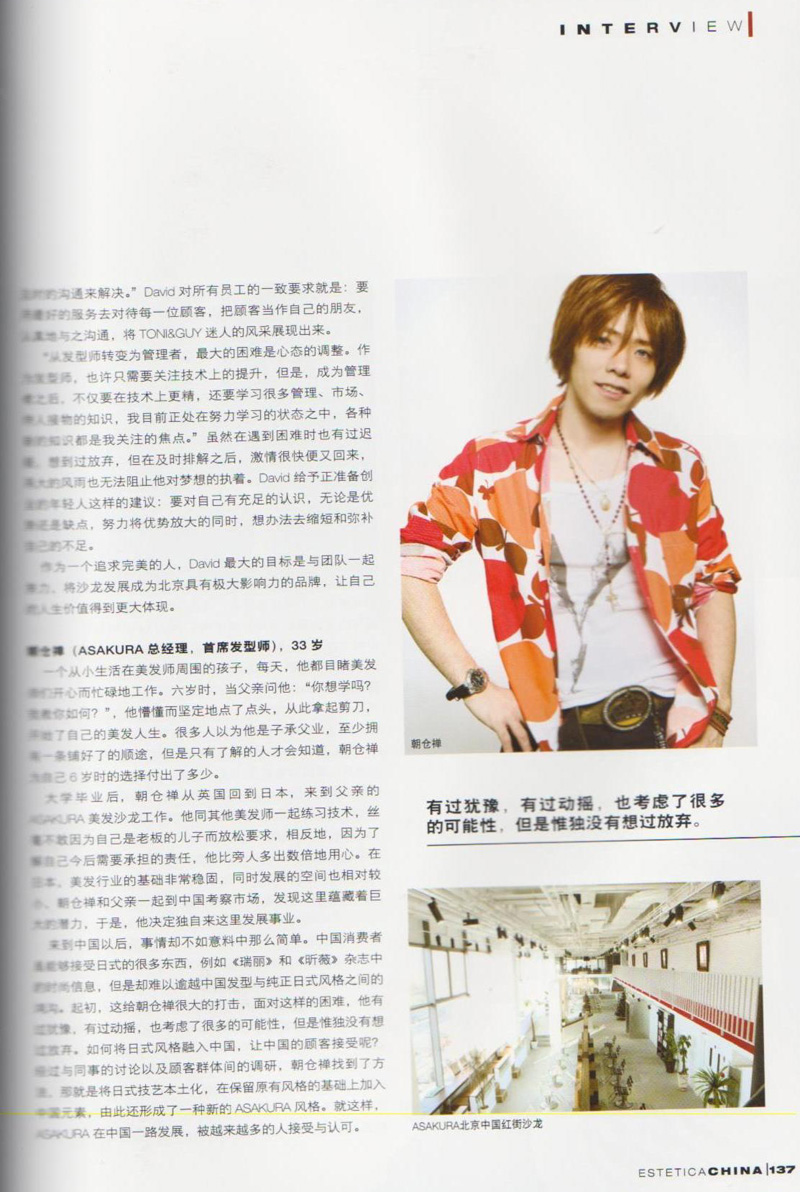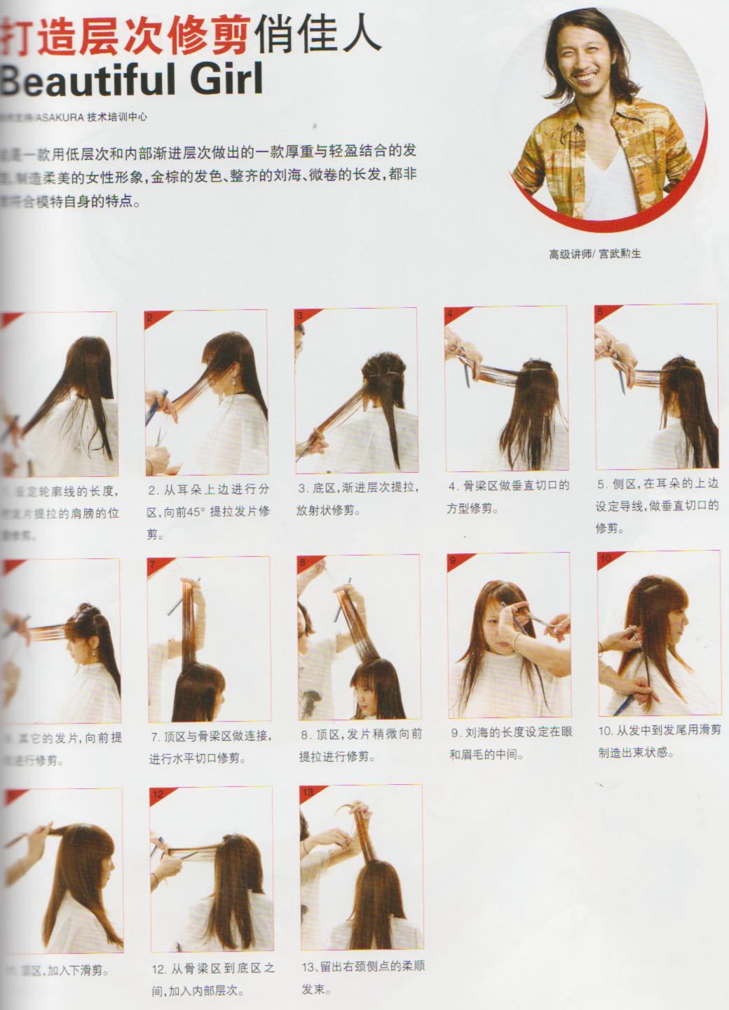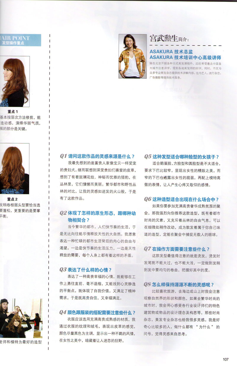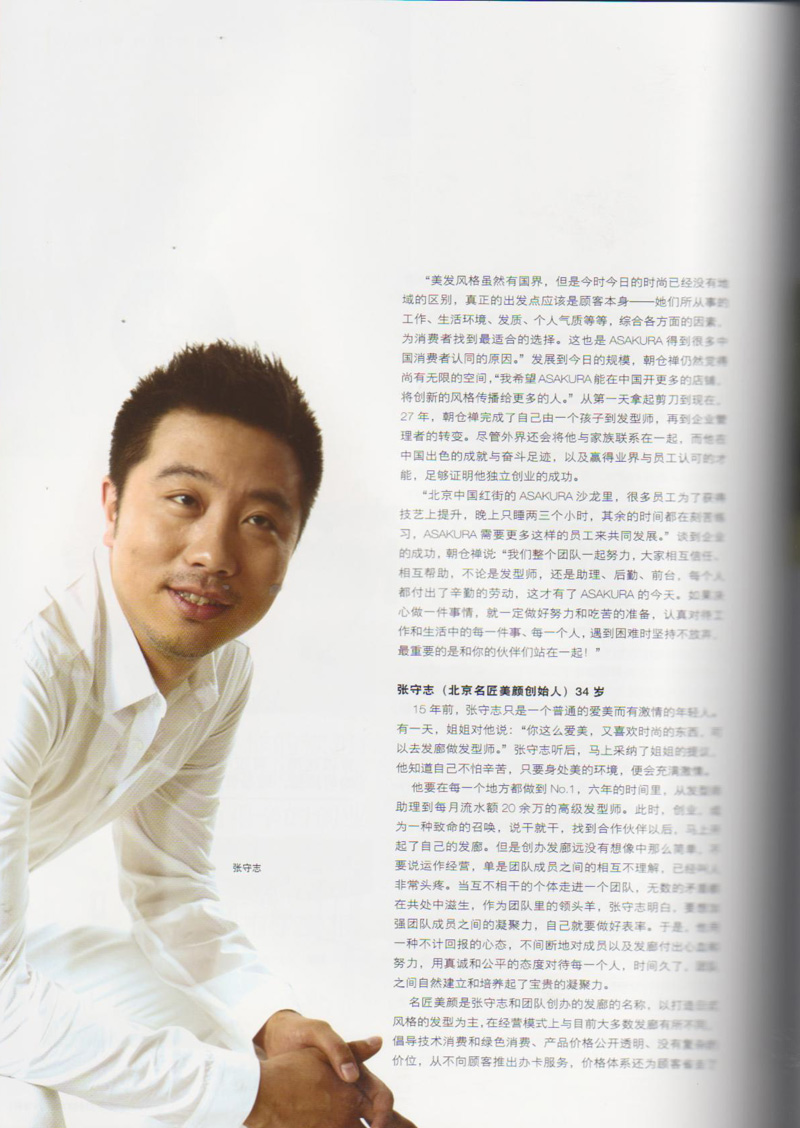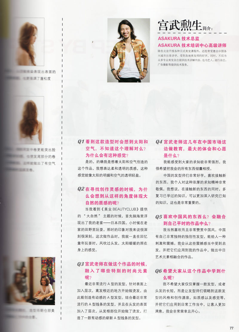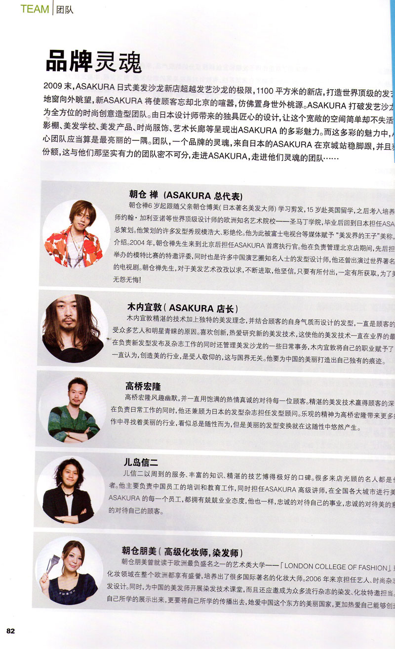 | 将日式发型技术真正的带给中国的美发师朋友们,ASAKURA老师们每月都挤出时间来,精心准备技术讲解,给各美发杂志提供技术资料,借助众多美发行业杂志平台与中国美发师们交流,带给中国清新自然的日本风!从04年起就给美业,美容美发等专业杂志一期不落地提供技术资料。目前为止每月ASAKURA培训中心给《美业》,《美容美发》,《翡仕》,《丝艺》,《彩》,《飘》,《现代沙龙》,《FM》,《TOP》等国内优秀美发杂志提供技术资料及发型作品。 |